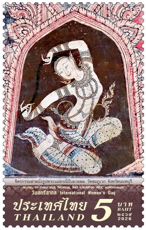 "พระเเม่ธรณีบีบบวยผม" มาจากตำนานตอนที่พระพุทธเจ้าทรงเอาชนะพญามารก่อนตรัสรู้ โดยพระเเม่ธรณีได้ปรากฏตัวขึ้นบีบบวยผมให้น้ำไหลออกมาเป็นสาย เปรียบเสมือนผลบุญที่พระพุทธเจ้าสั่งสมมาในอดีต ไหลท่วมกองทัพมารจนพ่ายแพ้ไป พระแม่ธรณีเป็นสัญลักษณ์ของ "แม่" ผู้ให้กำเนิด น้ำที่ออกจากมวยผมเปรียบได้กับน้ำที่หล่อเลี้ยงเกษตรกรรมและชีวิตคนไทย แทนความเมตตาและพลังแห่งธรรมชาติ แสตมป์ชุดวันสตรีสากล 2569 เป็นภาพจิตรกรรมฝาผนังพระแม่ธรณีบีบบวยผมที่เลื่องลือว่างดงามที่สุดในโลก ณ อุโบสถวัดชมภูเวก จ. นนทบุรี