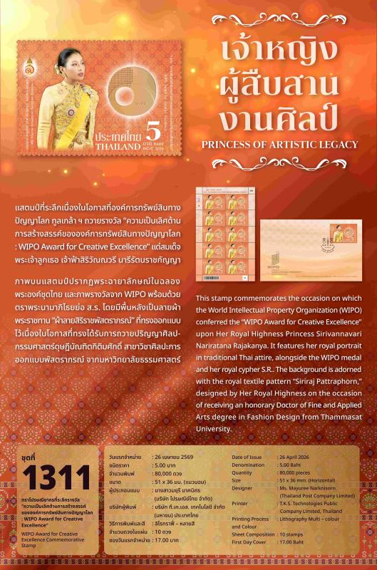 1311. ตราไปรษณียากรที่ระลึกรางวัล “ความเป็นเลิศด้านการสร้างสรรค์ขององค์การทรัพย์สินทางปัญญาโลก : WIPO Award for Creative Excellence”