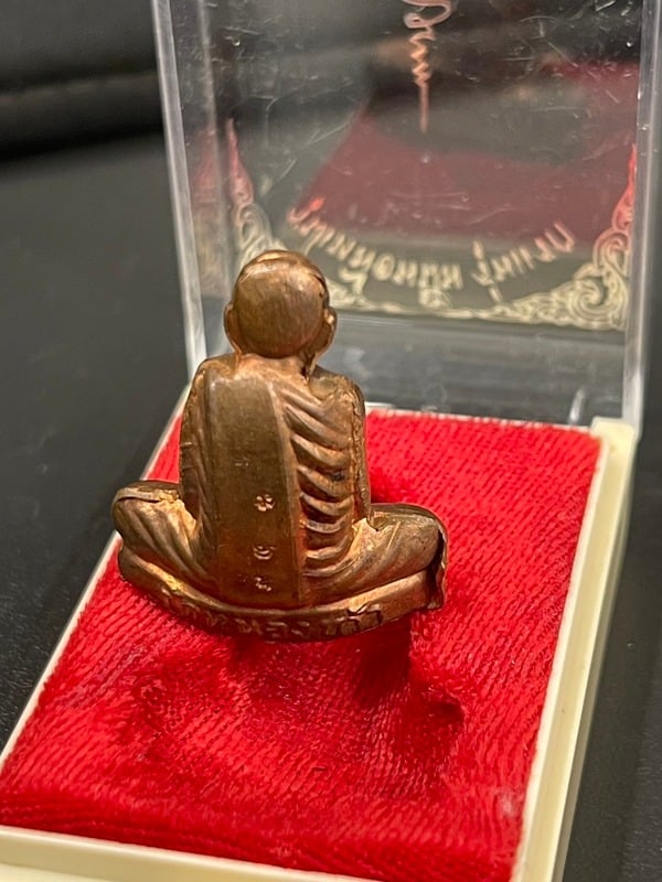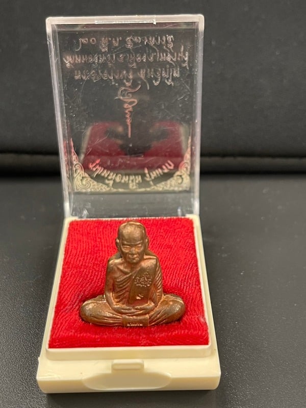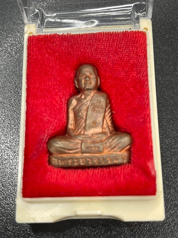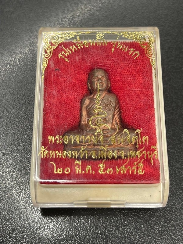 วัตถุมงคลชิ้นนี้เป็นรูปเหมือนขนาดเล็กของพระอาจารย์จิ สมจิตุโต เนื้ออัลปาก้า วางบนแผ่นผ้าสีแดงสด บรรจุในกล่องพลาสติก