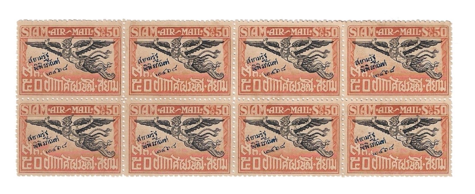มีที่มาจากรัชกาลที่ 6 ทรงครองสิริราชสมบัติครบ 15 ปี ทรงดำริให้จัดงานสยามรัฐพิพิธภัณฑ์ขึ้น เพื่อช่วยแก้ปัญหาวิกฤตทางเศรษฐกิจที่เกิดขึ้นทั่วโลกภายหลังเหตุการณ์สงครามโลกครั้งที่ 1 กรมไปรษณีย์โทรเลขจึงได้จัดทำแสตมป์ชุดนี้ขึ้นเพื่อเป็นที่ระลึกสำหรับการจัดงานดังกล่าว โดยใช้แสตมป์ชุดอากาศไปรษณีย์ชุดแรกพิมพ์ทับข้อความด้วยหมึกสีแดง และน้ำเงิน พิมพ์ที่โรงพิมพ์ของกระทรวงพระคลังมหาสมบัติ ใช้ข้อความว่า ”สยามรัฐพิพิธภัณฑ์ 2468” จัดพิมพ์ชนิดราคาละ 100,000 ดวง (7 ชนิดราคา) แต่รัชกาลที่ 6 ทรงพระประชวร และเสด็จสวรรคตเสียก่อน งานดังกล่าวจึงถูกยกเลิก ทำให้แสตมป์ชุดนี้ไม่ได้ออกจำหน่าย แต่ต่อมาภายหลังถูกนำมาใช้เป็นค่าธณรมเนียมธนาณัติ ค่าโทรเลข และค่าฝากส่งสิ่งตีพิมพ์จำนวนมาก