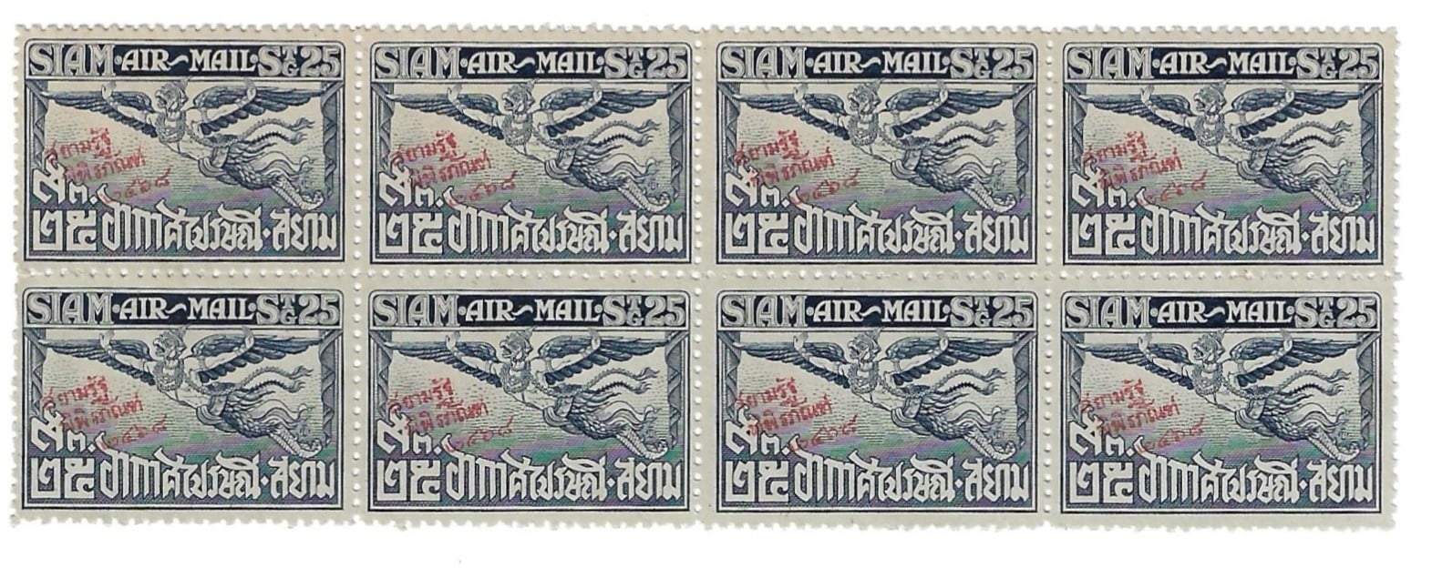 มีที่มาจากรัชกาลที่ 6 ทรงครองสิริราชสมบัติครบ 15 ปี ทรงดำริให้จัดงานสยามรัฐพิพิธภัณฑ์ขึ้น เพื่อช่วยแก้ปัญหาวิกฤตทางเศรษฐกิจที่เกิดขึ้นทั่วโลกภายหลังเหตุการณ์สงครามโลกครั้งที่ 1 กรมไปรษณีย์โทรเลขจึงได้จัดทำแสตมป์ชุดนี้ขึ้นเพื่อเป็นที่ระลึกสำหรับการจัดงานดังกล่าว โดยใช้แสตมป์ชุดอากาศไปรษณีย์ชุดแรกพิมพ์ทับข้อความด้วยหมึกสีแดง และน้ำเงิน พิมพ์ที่โรงพิมพ์ของกระทรวงพระคลังมหาสมบัติ ใช้ข้อความว่า ”สยามรัฐพิพิธภัณฑ์ 2468” จัดพิมพ์ชนิดราคาละ 100,000 ดวง (7 ชนิดราคา) แต่รัชกาลที่ 6 ทรงพระประชวร และเสด็จสวรรคตเสียก่อน งานดังกล่าวจึงถูกยกเลิก ทำให้แสตมป์ชุดนี้ไม่ได้ออกจำหน่าย แต่ต่อมาภายหลังถูกนำมาใช้เป็นค่าธณรมเนียมธนาณัติ ค่าโทรเลข และค่าฝากส่งสิ่งตีพิมพ์จำนวนมาก